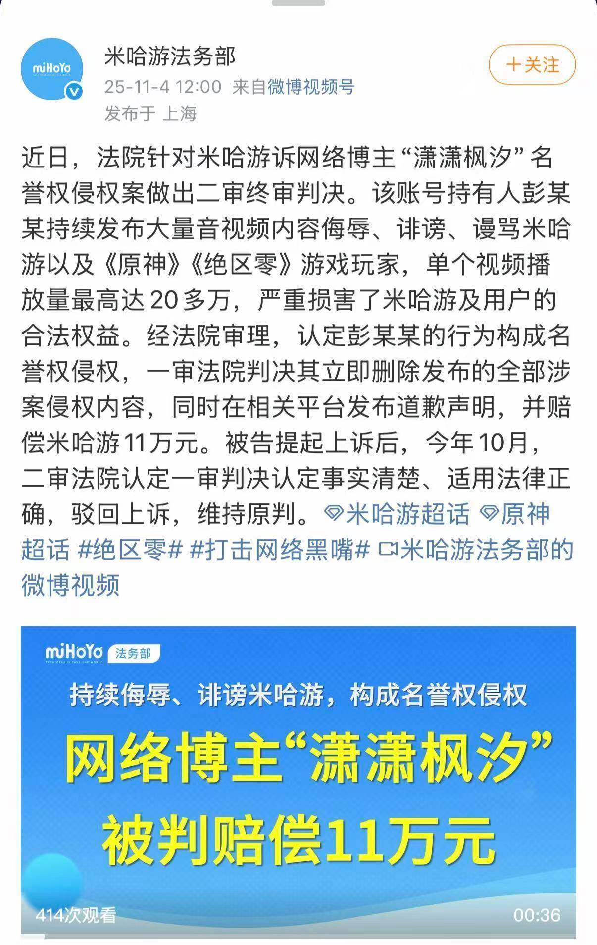 11日,米哈游法务部发文称,法院针对米哈游诉网络博主潇潇枫汐名誉权侵权案做出二审终审判决。